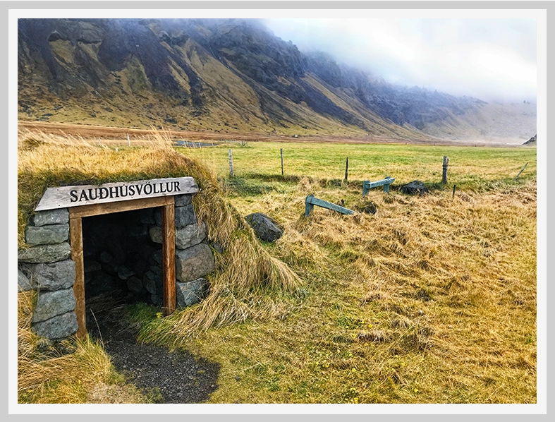 A low stone shelter tucked into golden grass sits quietly beneath Iceland’s misted highlands. Weathered rock, a simple wooden frame, and sweeping pastureland create a scene that feels both ancient and alive. This photograph captures the quiet resilience and rural character of Iceland’s moody highlands.
